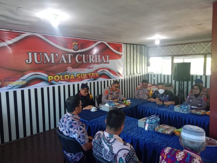 Jumat Curhat ini dipimpin langsung oleh Wadir Pam Obvit Polda Sultra, AKBP Darmono, serta dihadiri oleh Wadansat Brimob AKBP Indra Yanitra Irawan dan jajaran perwakilan pejabat utama Polda Sultra bertujuan untuk memberikan kesempatan kepada masyarakat nelayan untuk menyampaikan permasalahan yang mereka alami.