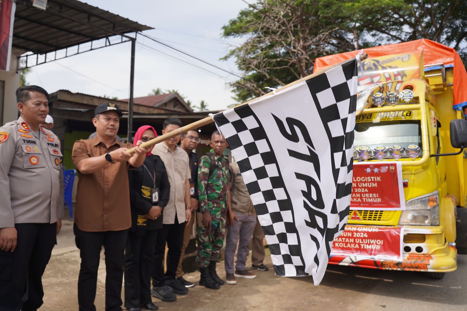 Bupati Koltim, Abdul Azis melepas secara simbolis pendistribusian logistik pemilu 2024 di 12 Kecamatan se-Koltim.