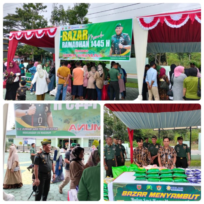 Raha, Sinarsultra.com – Sebagai upaya meringankan beban masyarakat ditengah lonjakan kenaikan harga bahan pokok di pasaran, Kodim 1416/Muna menggelar Bazar Murah di Bulan Suci Ramadhan.