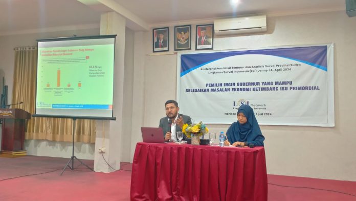 Kendari, Sinarsultra.com – Lembaga Lingkaran Survei Indonesia (LSI) Denny JA merilis hasil temuan dan analisis survei elektabilitas Calon Gubernur (Cagub) Provinsi Sulawesi Tenggara (Sultra) tahun 2024, di salah satu Hotel Kota Kendari, Selasa 30 April 2024.