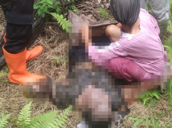Jasad korban saat ditemukan dalam keadaan meninggal dunia di kebun coklat.