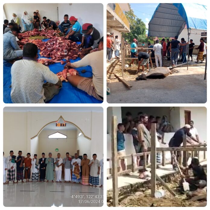 Raha, Sinarsultra.com- Dalam merayakan hari Raya Idul Adha 10 Zulhijjah 1445 H, pengurus mesjid Al Abror kembali mengadakan pemotongan hewan Qurban sebanyak 4 ekor sapi dan 1 ekor kambing, hasil dari sumbangan jamaah dan warga sekitar.