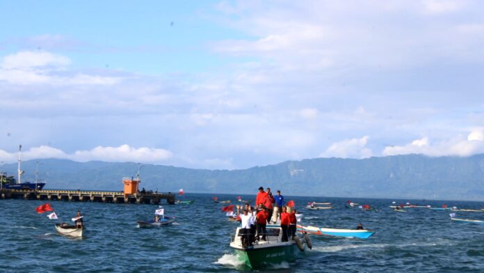 Dalam penjemputan BAHTERA di perairan pelabuhan Nusantara Raha, telihat sekitar 100 buah kapal katinting yang terbagi dalam 9 kelompok nelayan melakukan arak-arakan menjemput pasangan Bachrun – Asrafil sebagai bentuk keberpihakan nelayan mendukung pasangan Bachrun – Asrafil pada Pilkada Muna 2024 mendatang.