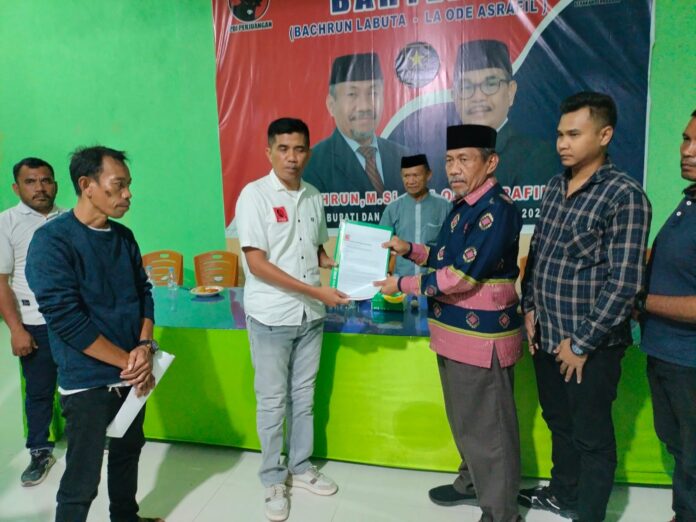 Penyerahan surat keputusan dukungan tersebut dilaksanakan di Posko Pemenangan BAHTERA, di Jalan Lumba-Lumba, Kota Raha, Selasa 17 September 2024.