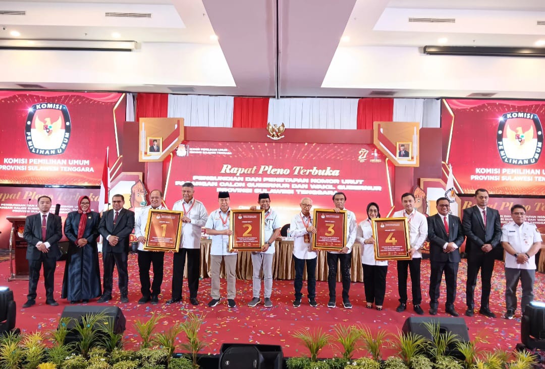 Kendari, Sinarsultra.com – Komisi Pemilihan Umum (KPU) Sulawesi Tenggara (Sultra) menetapkan nomor urut pasangan calon yakni, Ruksamin-Syafei Kahar nomor urut 1, Andi Sumangerukka-Hugua 2, Lukman Abunawas-La Ode Ida 3 dan Tina Nur Alam-LM Ihsan Taufik Ridwan 4