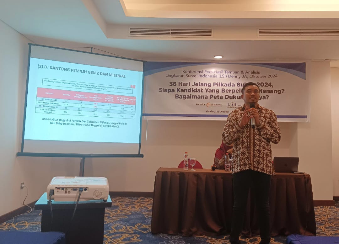 Kendari, Sinarsultra.com – Lingkaran Survei Indonesia (LSI) Denny JA merilis hasil analisis jelang pemilihan Gubernur dan Wakil Gubernur (Pilgub) Sulawesi Tenggara (Sultra) di salah satu hotel di Kota Kendari, Kamis 23 Oktober 2024.