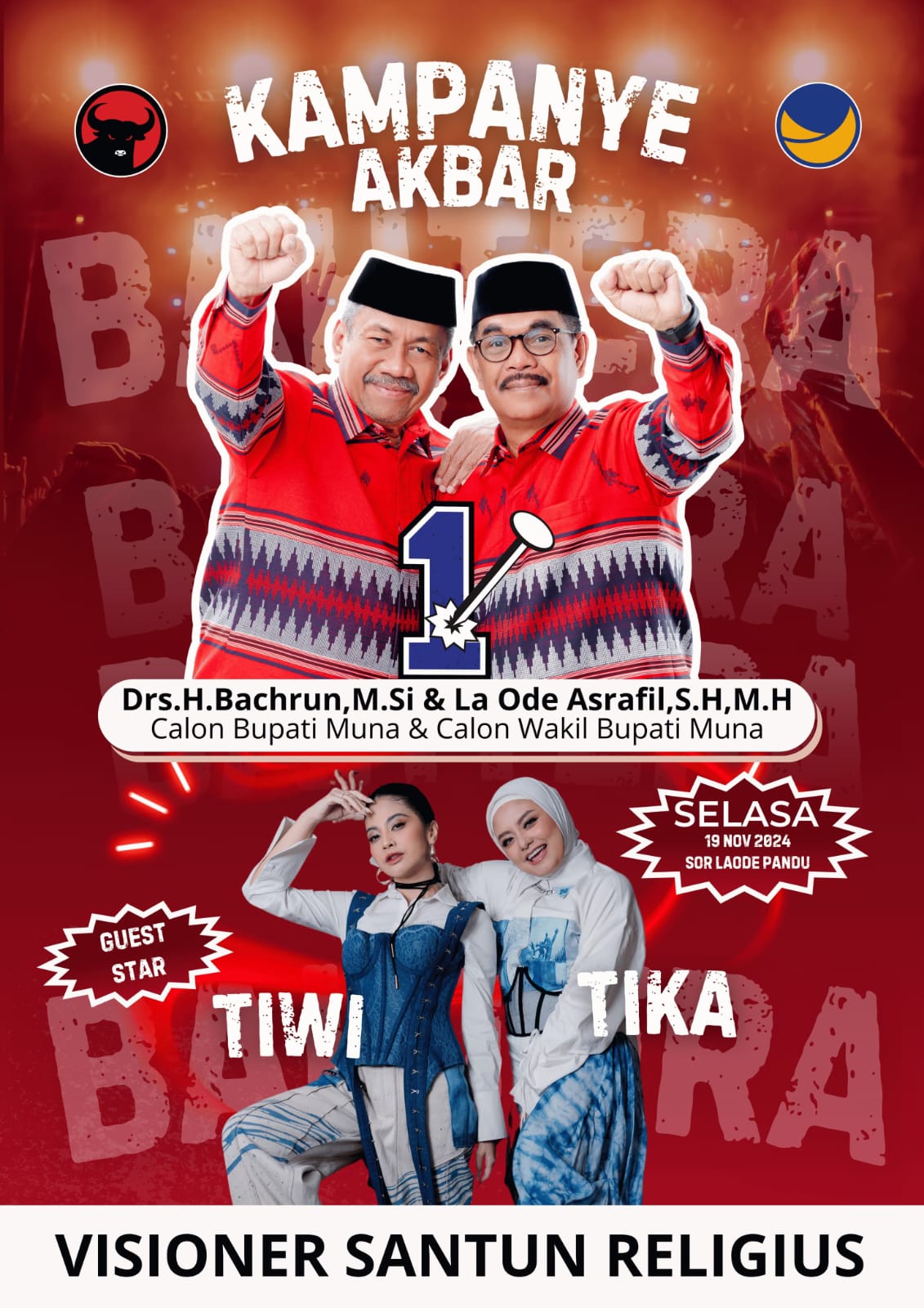 “Insyaallah, selain akan dihadiri pendukung dan simpatisan pasangan Bachrun-Asrafil dari seluruh Kecamatan, juga akan dihibur oleh artis ibu kota, Tika dan Tiwi,”imbuhnya.