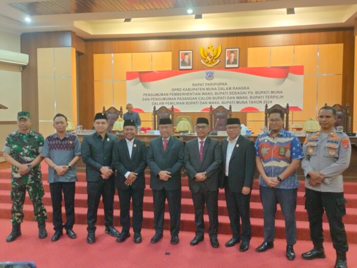Raha, Sinarsultra.com- Dewan Perwakilan Rakyat Daerah (DPRD) Muna, Sulawesi Tenggara (Sultra) menggelar rapat paripurna dalam rangka pengumuman pemberhentian wakil bupati sebagai Plt. Bupati Muna dan pengumuman pasangan calon bupati dan wakil bupati terpilih dalam pemilihan bupati dan wakil bupati Muna tahun 2024.